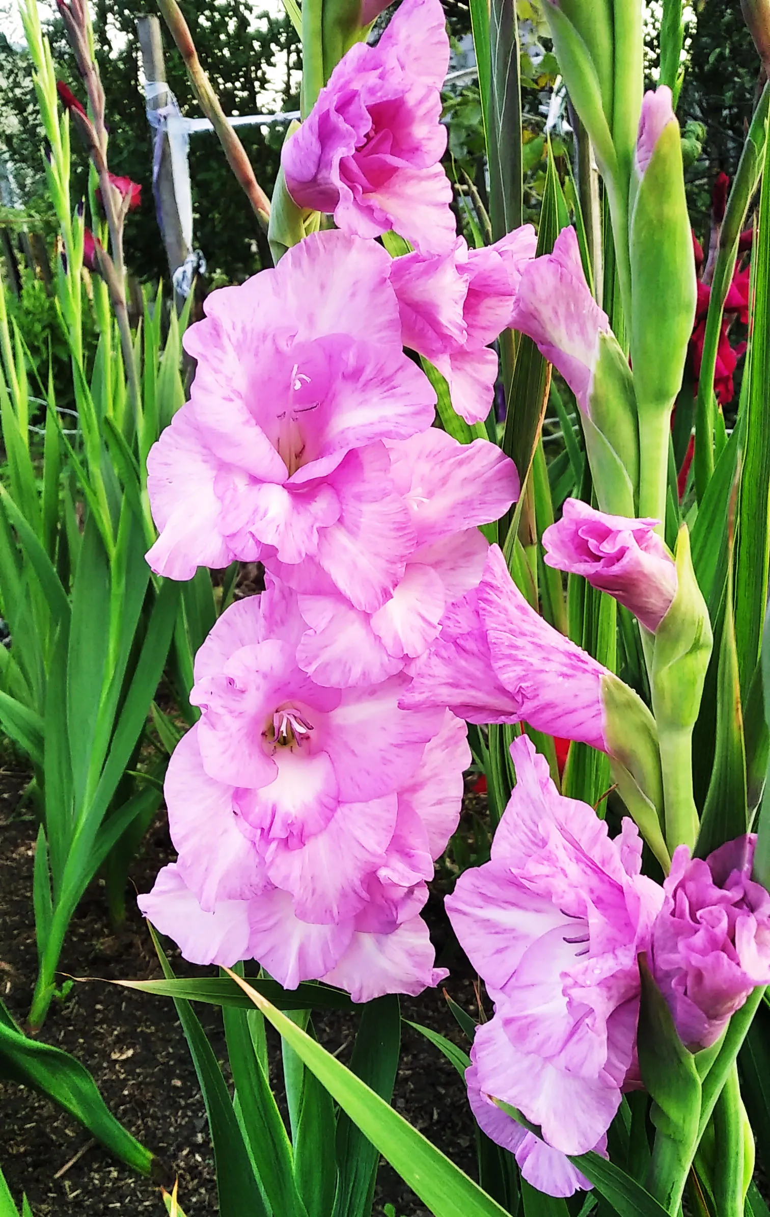 Крупные, плотные цветы. Нежно-сиреневого цвета с желто-белым пятном в горловине. Очень долго стоит в срезке, цветет, постепенно распускаясь, до самого верха.