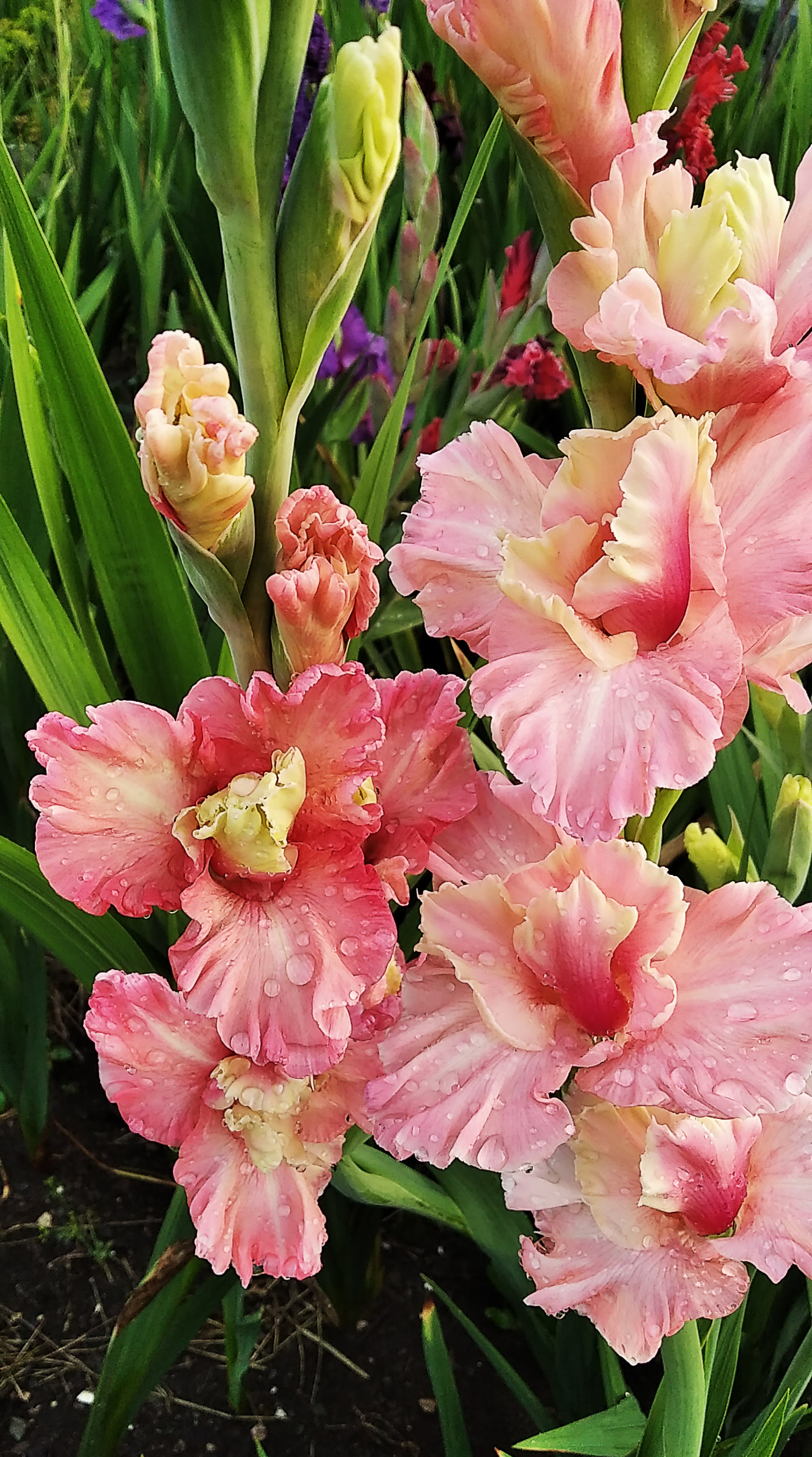 Поздний. Идеально ровный колос. Бутоны плотно располагаются на цветоносе. Цветки крупные, сильно гофрированные. Основной цвет лепестков – палевый, нижний лепесток желтый, внутри цветов яркое пятно.