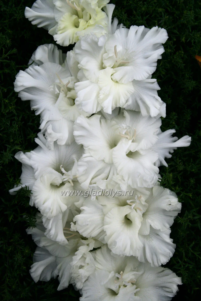 Мощный, высокий гладиолус с гирляндой сильно гофрированных сиренево-белых цветов. Яркий и нежный цвет. Гофрировка сильная, складчатая, ткани лепестков очень плотные. Цветет долго, постепенно распускаясь, до самого верха. Впечатляет размерами!